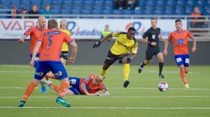 Det var bortimot envegskjøring i første omgang på Color Line stadion i kveld, og Aalesund ledet 2-0 til pause. Solo Owusu (bildet) jobbet som en okse på stopperplass sammen med Marius Alm, men sunnmøringene ble som forventet for sterke og vant tilslutt 3-1.